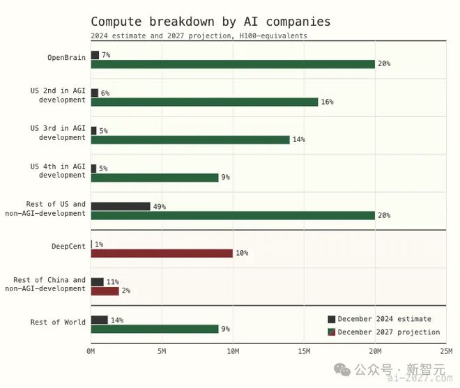 在他们的推演中,中国将在 2026 年开始集中算力资源,把 15% 算力份额中的 10% 集中到一个单一的大型 AI 项目中;而美国的算力资源则依然处于分散状态。