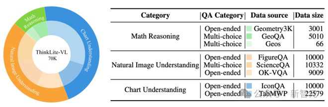 研究人员首先从广泛使用的开源多模态训练数据集中收集了 70k 的样本,涵盖了三个关键的视觉任务:数学推理,自然图像理解和图表理解,具体的数据分布和来源如下表所示。