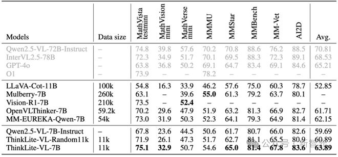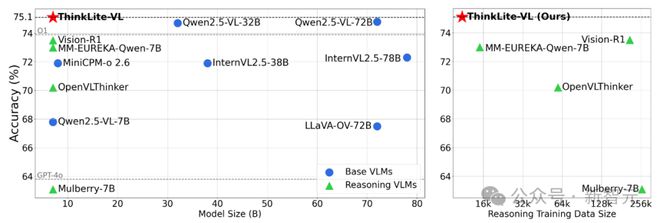特别地,在 MathVista 上 ThinkLite-VL-7B 达到了 75.1 的 SoTA 准确率,超过了 GPT-4o 和 o1 等闭源模型和 Qwen2.5-VL-72B 等开源更大参数量的模型。