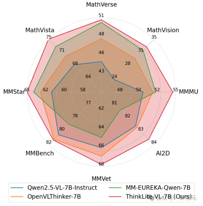 在八个主流视觉推理任务上进行测试,包括 MathVista, MathVerse, MathVision,MMMU,MMStar, MMVet, MMBench 和 AI2D, 结果发现 ThinkLite-VL-7B 的平均性能相比 base model Qwen2.5-VL-7B-Instruct 提升了7%,从 59.69 提高到 63.89,并且显著优于使用随机采样选择相同大小数据量进行强化学习训练的模型。