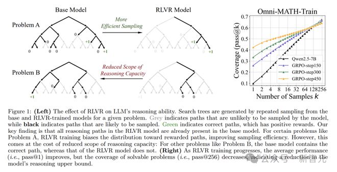 图1:(左)灰色表示模型不太可能采样的路径,黑色表示大概率采样的路径,绿色表示正确的路径(带有正向奖励)。(右)随着 RLVR 训练的进行,模型的平均性能(即 pass@1)有所提升,但可解决问题的覆盖率(即 pass@256)下降,表明模型推理能力的上限在降低