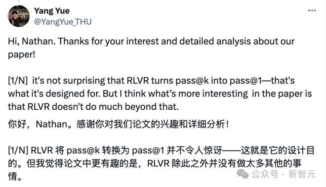本文作者 Yang Yue 也表示实验结果表明,RLVR 除此之外并没有做太多其他的事情。