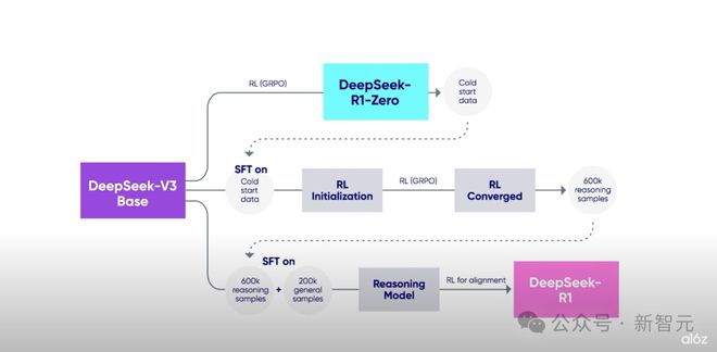 在 DeepSeek-R1 的训练过程中,第一步就是通过基于 GRPO 的纯强化学习,训练出了 DeepSeek-R1-Zero,后续的训练过程都涉及到强化学习。