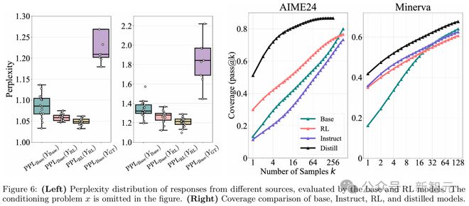 结果显示(图 6 左),RL 训练模型的回答困惑度分布与基础模型生成回答的低困惑度部分高度重合,这说明 RL 训练模型的回答很可能是基础模型本身就能生成的。