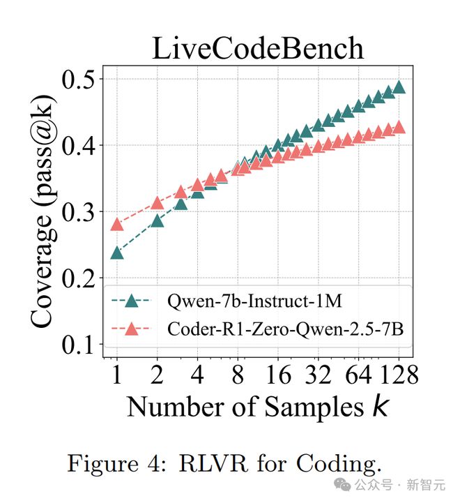 例如,在 LiveCodeBench 上,原始模型 pass@1 得分是 23.8%,RLVR 训练的模型为 28.1%,可当采样 128 次时,原始模型能解决约 50% 的编程问题,而 RLVR 模型只能解决 42.8%。