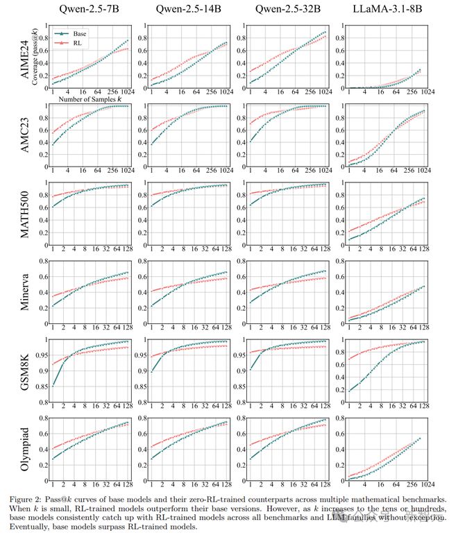虽然小k值下 RL 训练模型通常优于基础模型,但当k值变大时,基础模型在所有测试中都表现更好。令人惊讶的是,在足够大的k值下,基础模型的 pass@k分数甚至超过 RL 训练模型。这表明,未经 RL 训练的基础模型通过多样化采样,就能生成原本以为只有 RL 模型才能解决的正确答案。