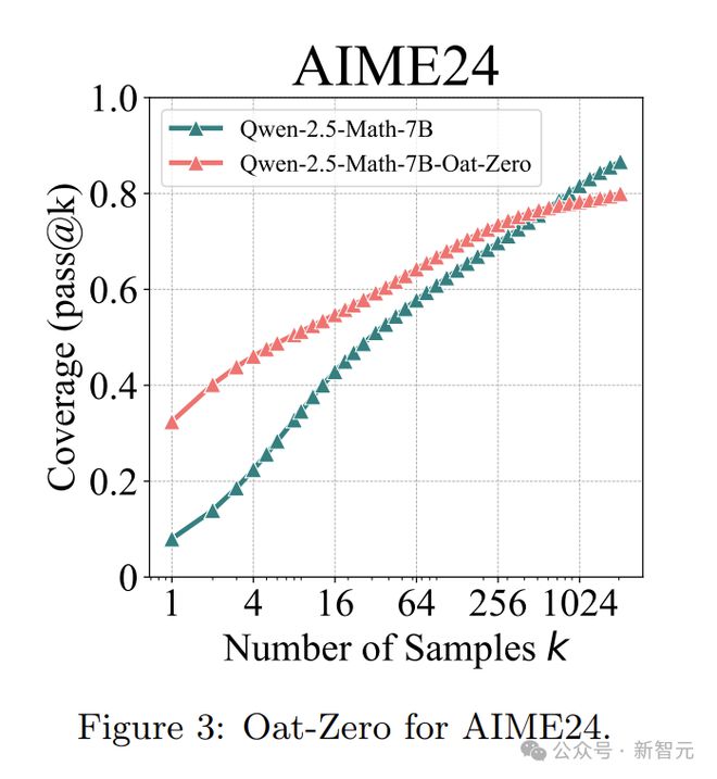在 AIME24 这种极具挑战性的测试中,一开始,基于 Qwen-2.5-7B-Base 训练的 RL 模型 Oat-Zero-7B 表现很不错,比基础模型高出近 30%,可最后还是被基础模型超越了。