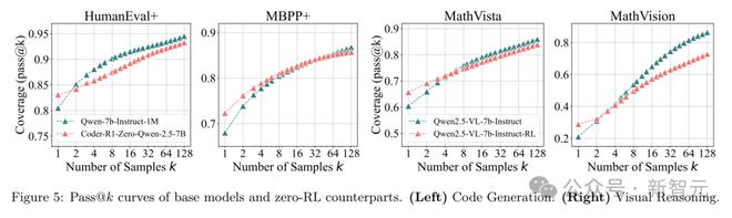 基础模型在可解决问题的覆盖范围上更具优势,RLVR 并没有让模型获得超越基础模型的推理能力。