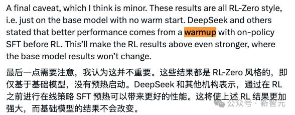 在 R1 的训练过程中,还有很多「热身」的过程,比如对冷启动数据后的 SFT,这些在强化学习训练开始前的「热身」过程可以给模型带来更强大的能力。
