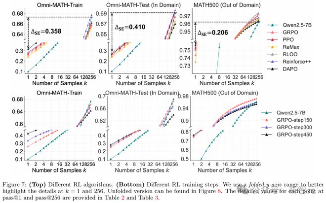 结果显示(图 7 上),不同 RL 算法在 pass@1 和 pass@256 上的表现略有差异,但无根本性区别。