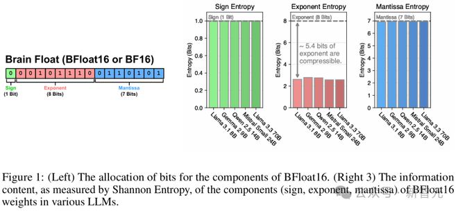 为了推动 LLM 权重的无损压缩,团队分析了最新 LLM 权重中 BFloat16 各个组成部分(符号、指数和尾数)的可压缩性。