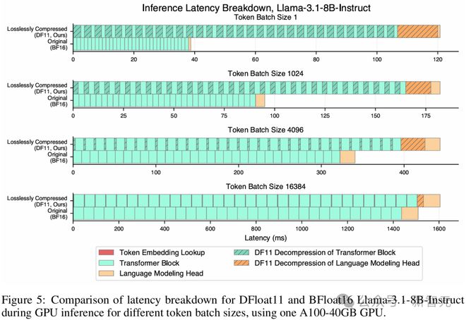 图 5 展示了在不同的批处理大小下,使用 DFloat11 压缩的 Llama-3.1-8B-Instruct 模型的延迟细分情况。
