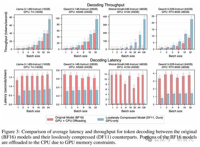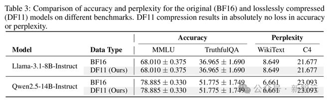 为了进一步验证无损特性,他们将 DF11 解压后的 BF16 权重矩阵与表 2 中各模型的原始权重矩阵进行比较,确认两者在比特级上完全相同。