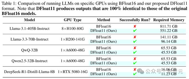 特别值得一提的是,DFloat11 成功地实现了 Llama-3.1-405B(810GB)在单节点上(8 块 80GB GPU)的无损推理。