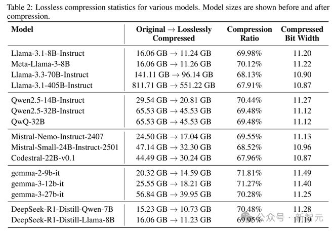 表 2 展示了 DF11 对多种最新 LLM 的压缩比率。