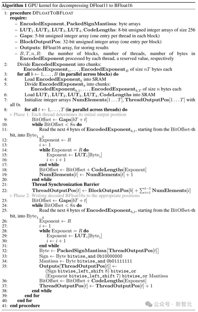 LLM 的权重以 DFloat11 格式存储,同时还包含轻量级的辅助数据:线程级的间隙偏移量以及块级的输出位置,这些数据用于确定每个线程的读取和写入位置。
