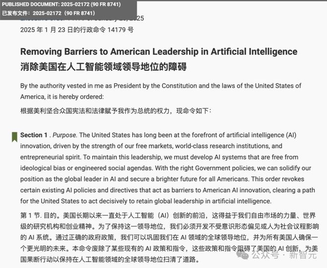 早在 2025 年 1 月 23 日,美国就公布了新任总统 Trump 签字的美国总统行政命令(行政命令 14179),旨在消除美国在 AI 领域领导地位的障碍。