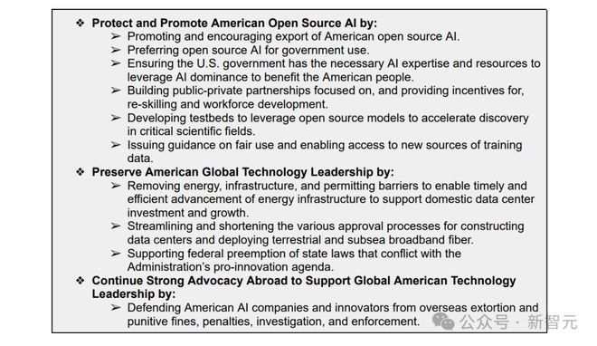 简化数据中心的能源和建设审批流程,推动先进核能技术发展,避免各州 AI 法规的碎片化,防止对创新造成阻碍。