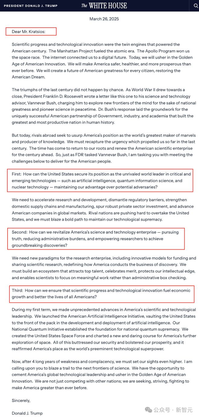 在 3 月 26 号的一封白宫公开信中,特朗普对 Michael Kratsios 发出了灵魂三问。