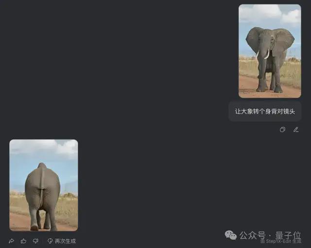 丢过去一张大象正面照和一句非常简单的提示词:让大象转个身背对镜头。
