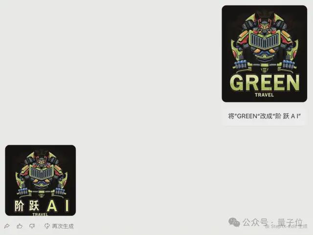 输入一张有两行字的图片,并指定让其中的“GREEN”修改为“阶跃 AI”字样。