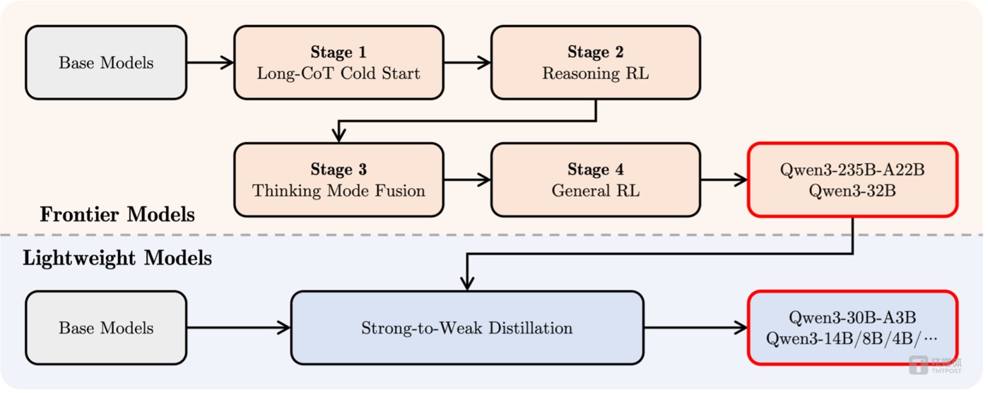 后训练方面,为了开发能够同时具备思考推理和快速响应能力的混合模型,千问团队实施了一个四阶段的训练流程。该流程包括:(1)长思维链冷启动,(2)长思维链强化学习,(3)思维模式融合,以及(4)通用强化学习。