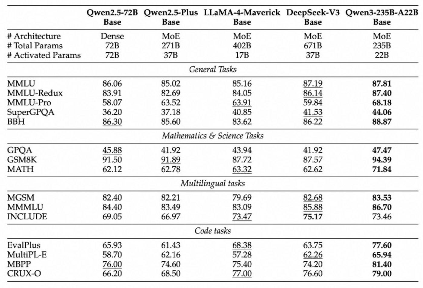 由于模型架构的改进、训练数据的增加以及更有效的训练方法,Qwen3 Dense 基础模型的整体性能与参数更多的 Qwen2.5 基础模型相当。