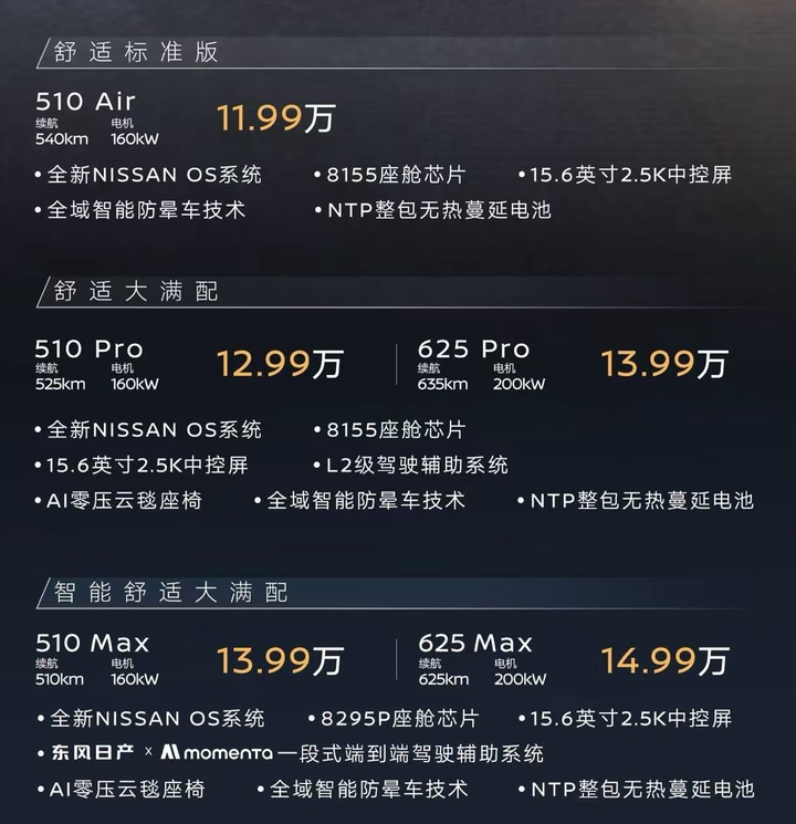 日产 N7 这次提供了 5 个版本,有 510km 和 625km 两种续航,Air、Pro、Max 三种配置。