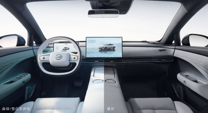 内饰方面,日产 N7 提供了浅灰/黑色和森绿/雪白两款双拼配色,和其他新能源在风格上区别不大。座舱内配备了 15.6 英寸 2.5K 悬浮式中控屏和独立仪表屏,低配和高配车型分别为高通骁龙 8155 或 8295P 座舱芯片,运行 NISSAN OS 超级车机系统并且也接入了 DeepSeek 大模型。