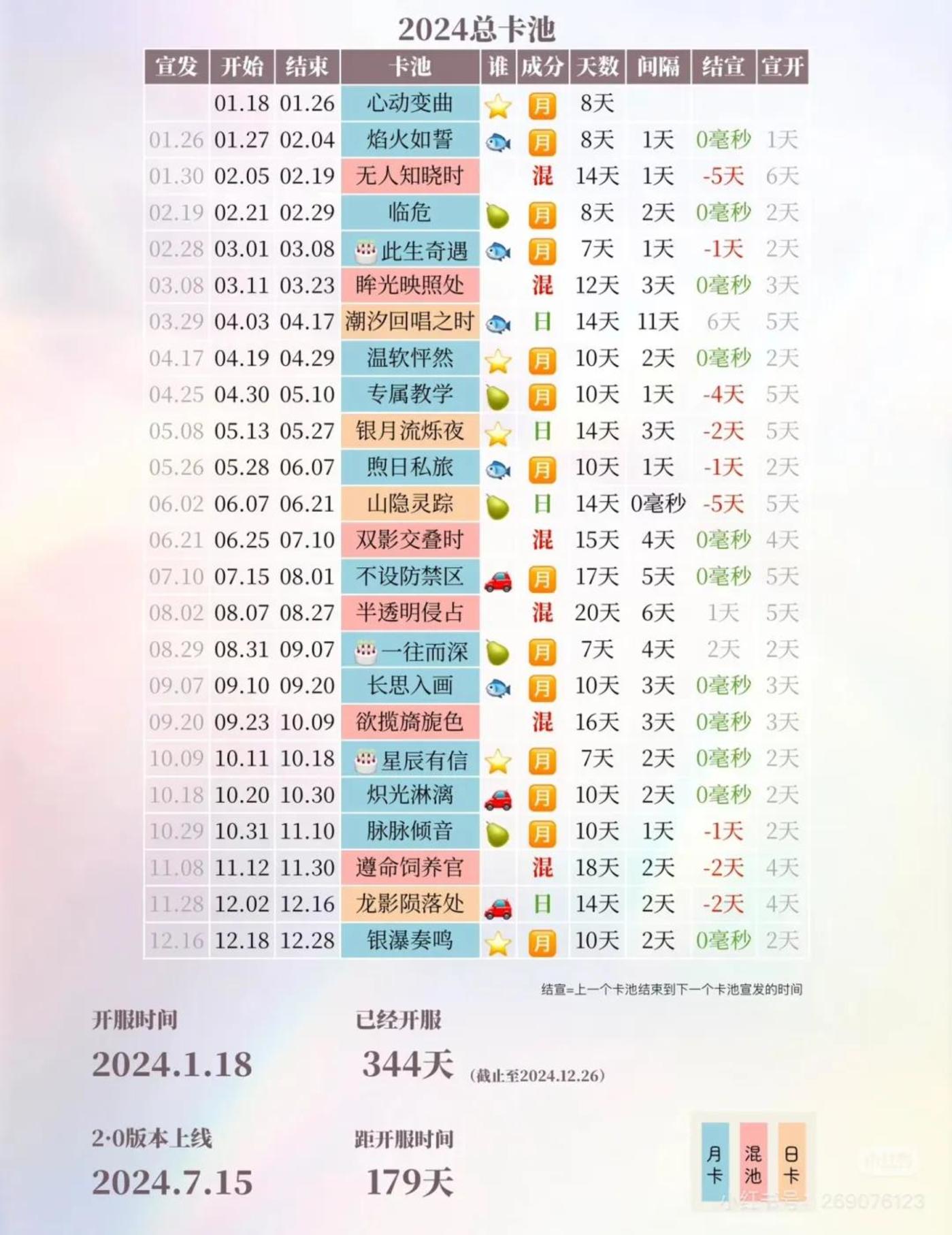 玩家总结的《恋与深空》2024 活动卡池排期报告。图源:小红书