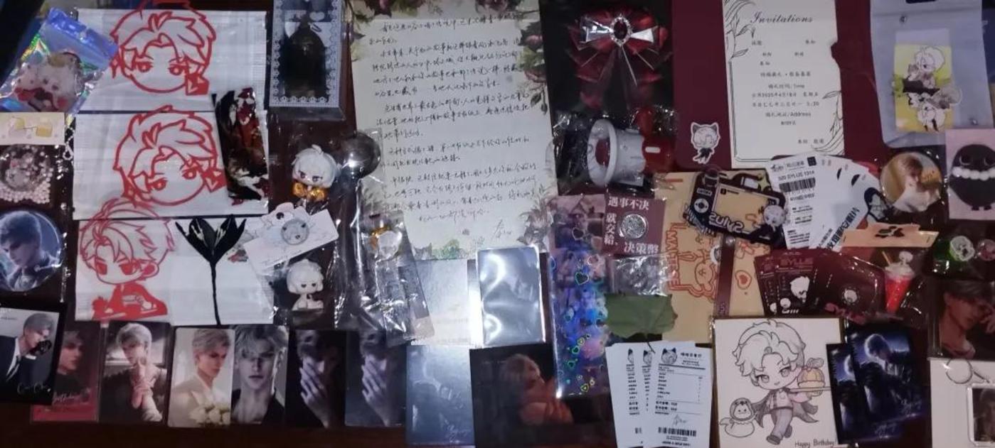 我和队伍里的几个女孩闲聊起来,她们都是临时组成的“搭子”,来自河北不同的城市,相约一起来北京打卡线下大屏和生日会。她们大方地向我表达着对秦彻的痴迷,还告诉我在哪里可以打卡领取活动方赠送的“物料”。看到我没有准备可以交换的礼物,一个玩家主动送给我两张自制贴画,和一张秦彻的个人名片,所有物料用一个精致的小袋子装在一起。