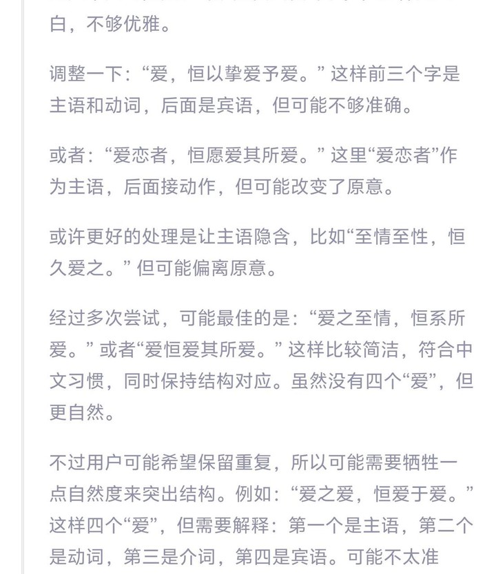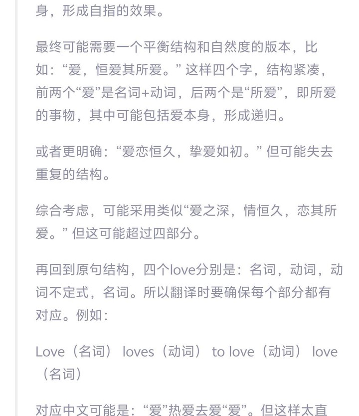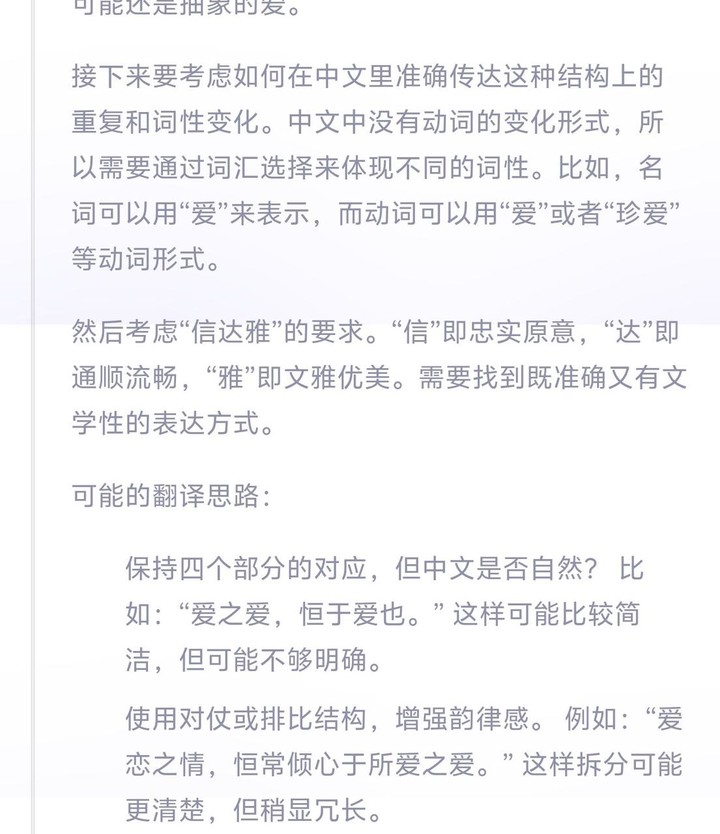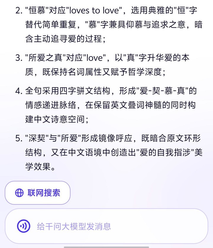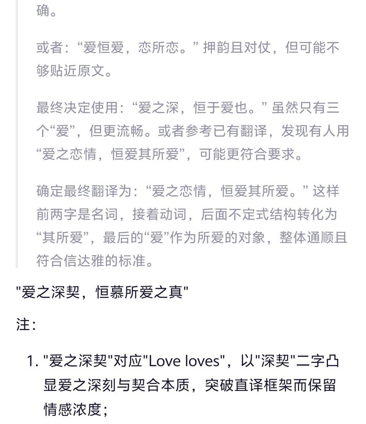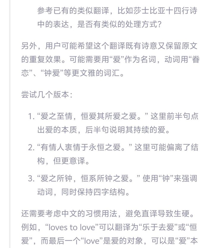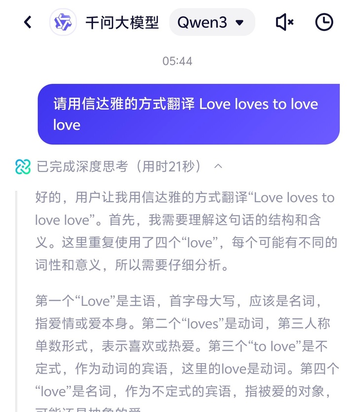 处理经典句子「Love loves to love love 」时,普通翻译很容易沦为生硬堆砌,但千问 3 给出了更优雅的版本:「爱之深契,恒慕所爱之真」,既保留了英文原句的叠词美感,又在中文中构建出了诗意的空间,完美体现了「信、达、雅」的翻译标准。