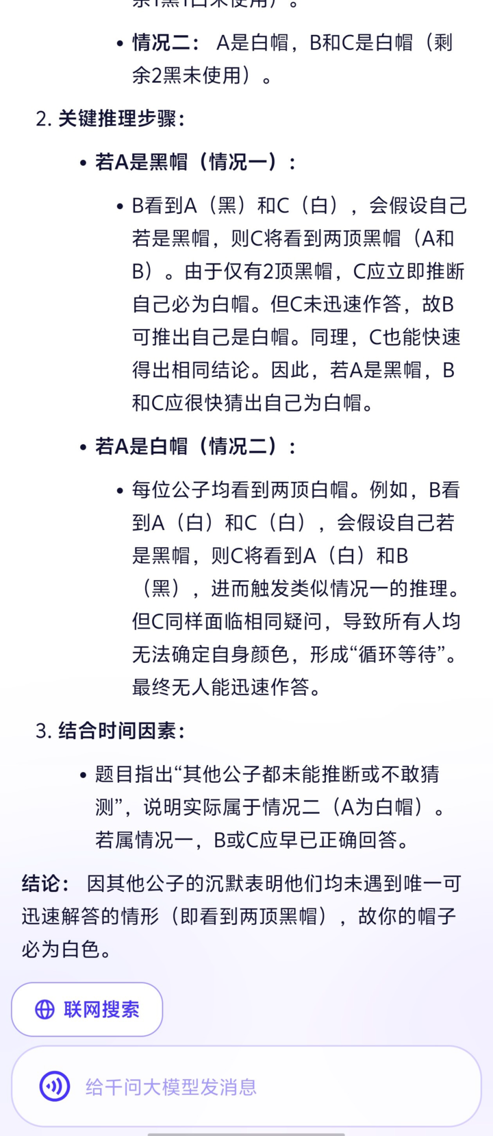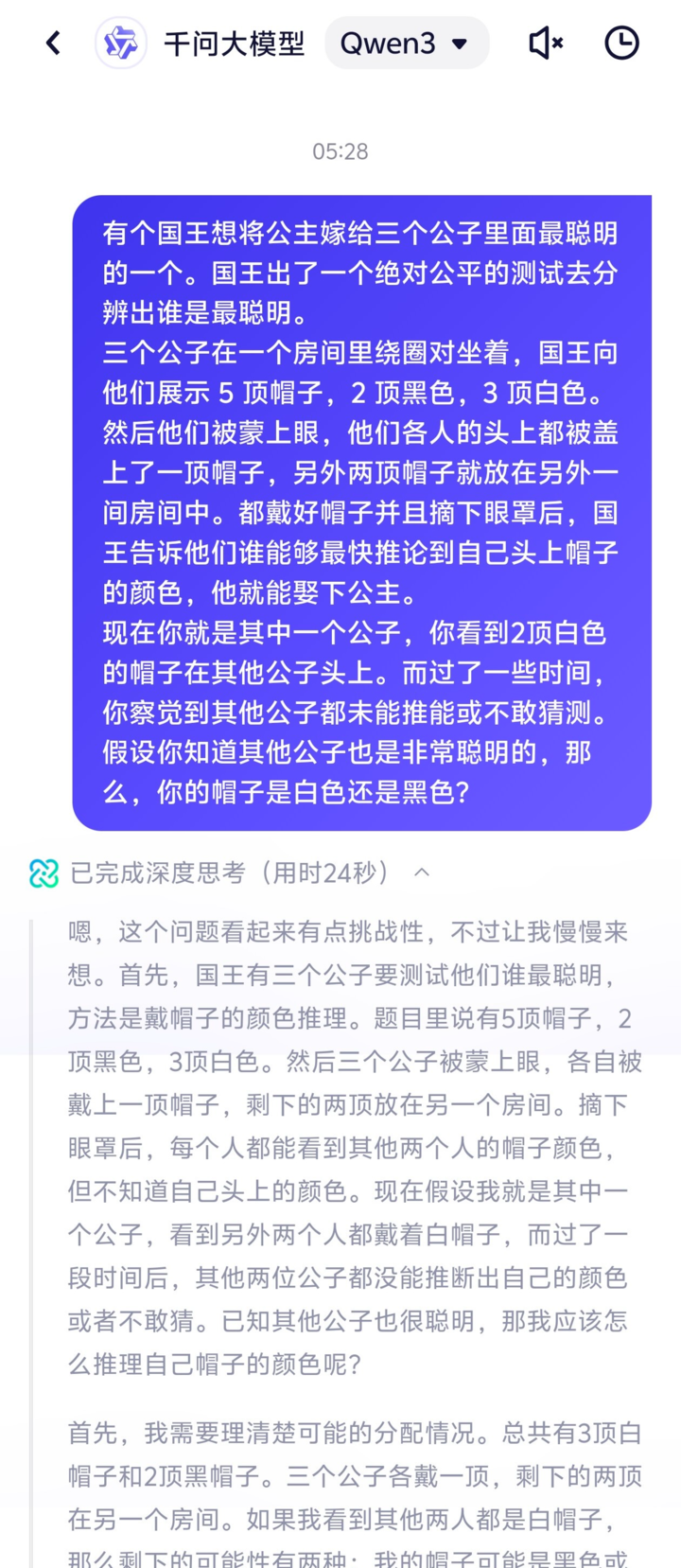 先来一道经典的推理题,看看目前搭载 Qwen3-235B-A22B 的通义 APP,是否已经能够解答我们之前碰到的一些「疑难杂症」。