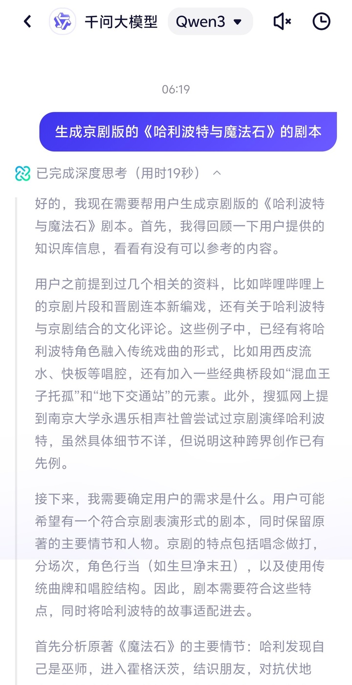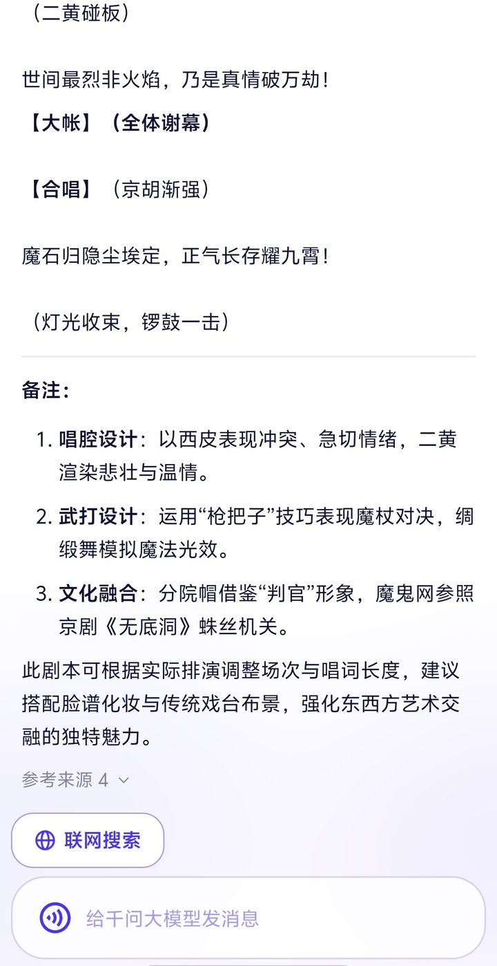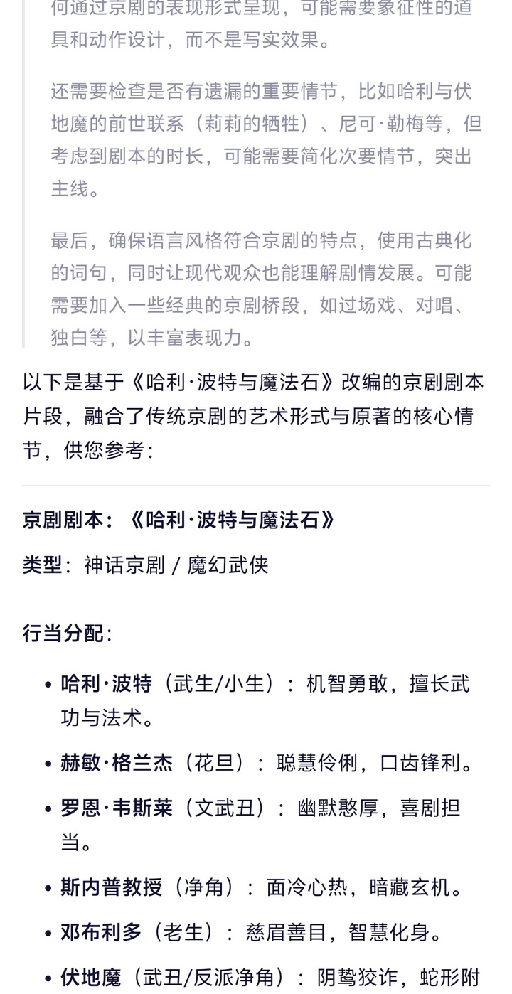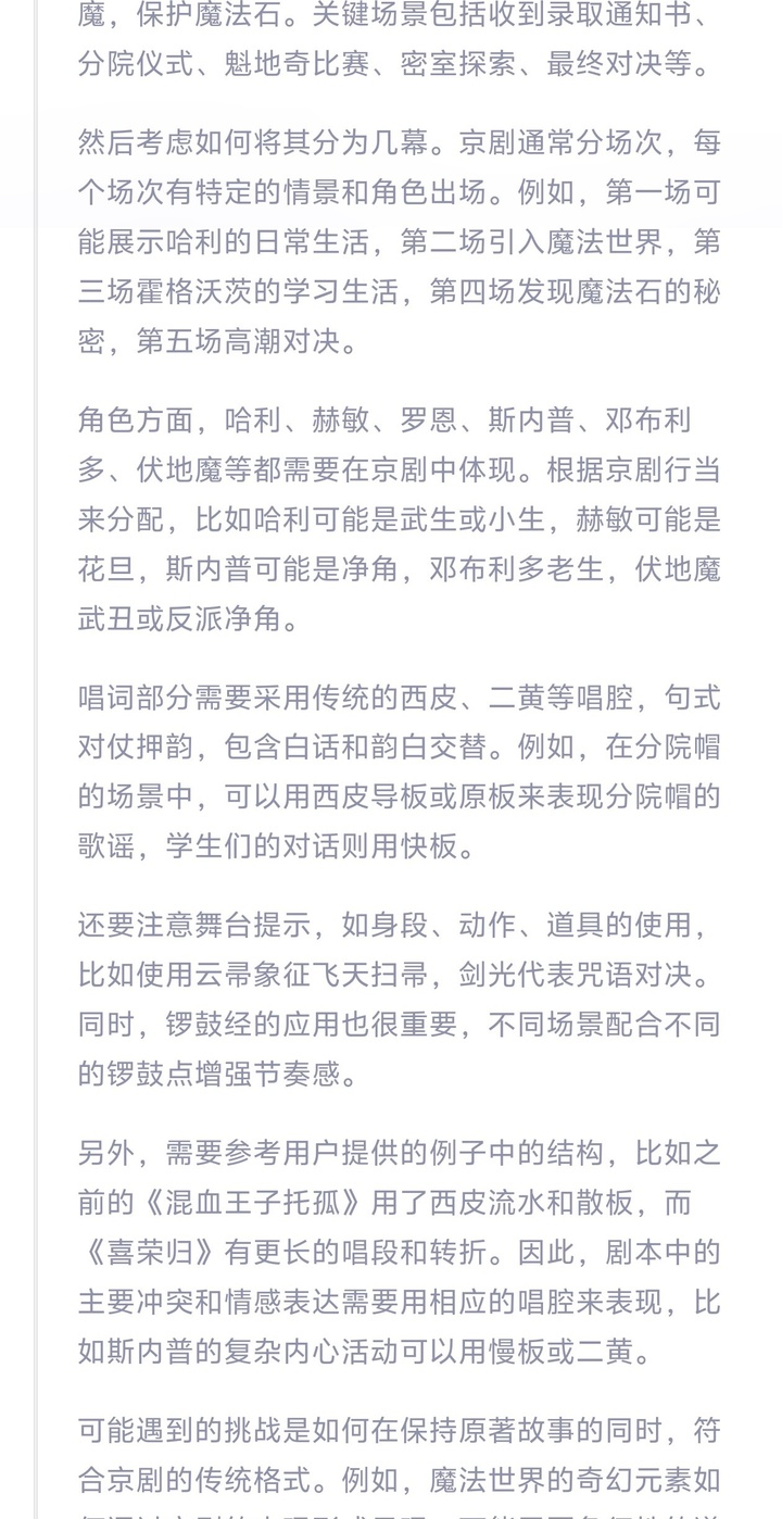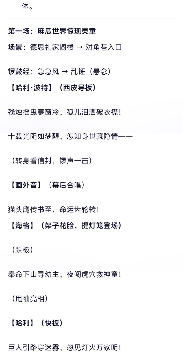 那换个角度,能否让千问 3 生成京剧版的《哈利波特与魔法石》的剧本?千问 3 哐哐一顿开写,剧本中融入了西皮、二黄、快板等多种京剧唱腔,情绪变化与传统程式一脉相承。