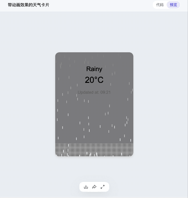 不止于此,我又提出了另一个要求,希望通义帮我做一个带有动画效果的天气卡片,要求是使用 HTML、CSS 和基础 JavaScript,实现时间和天气信息的动态更新。