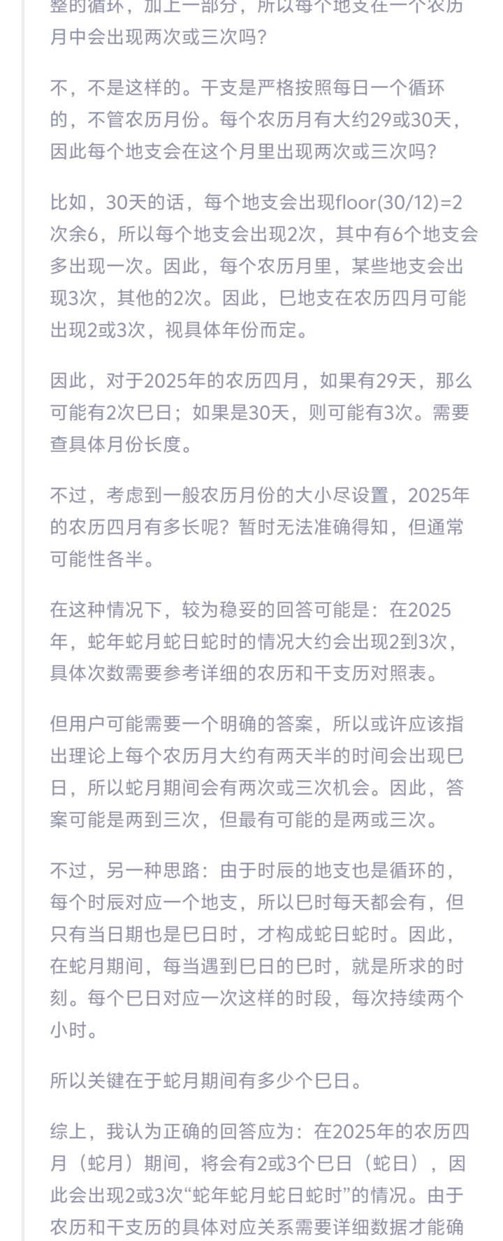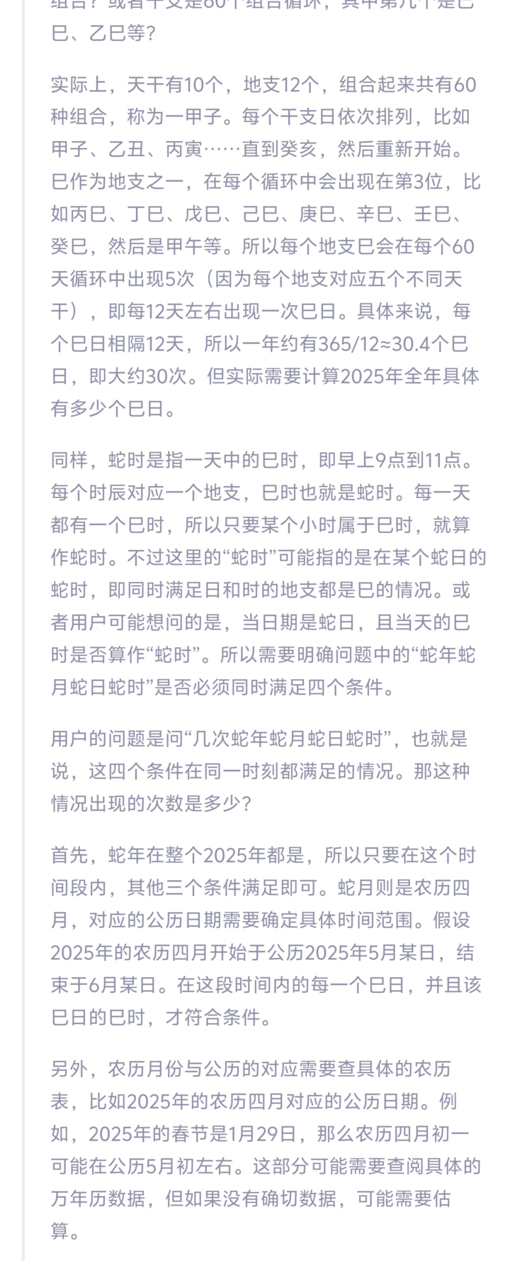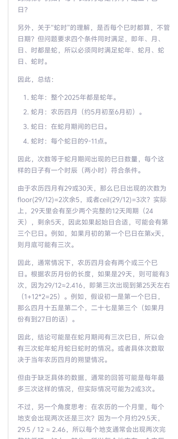 上点难度,来一道更复杂的。蛇年蛇月蛇日蛇时即将到来,2025 年会出现几次这种特殊时间节点?