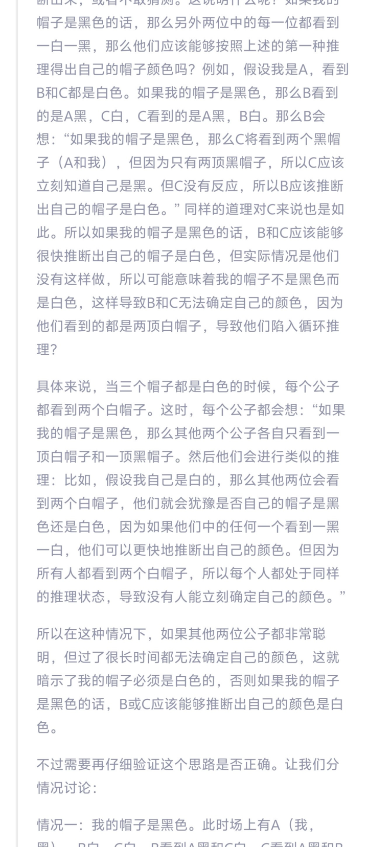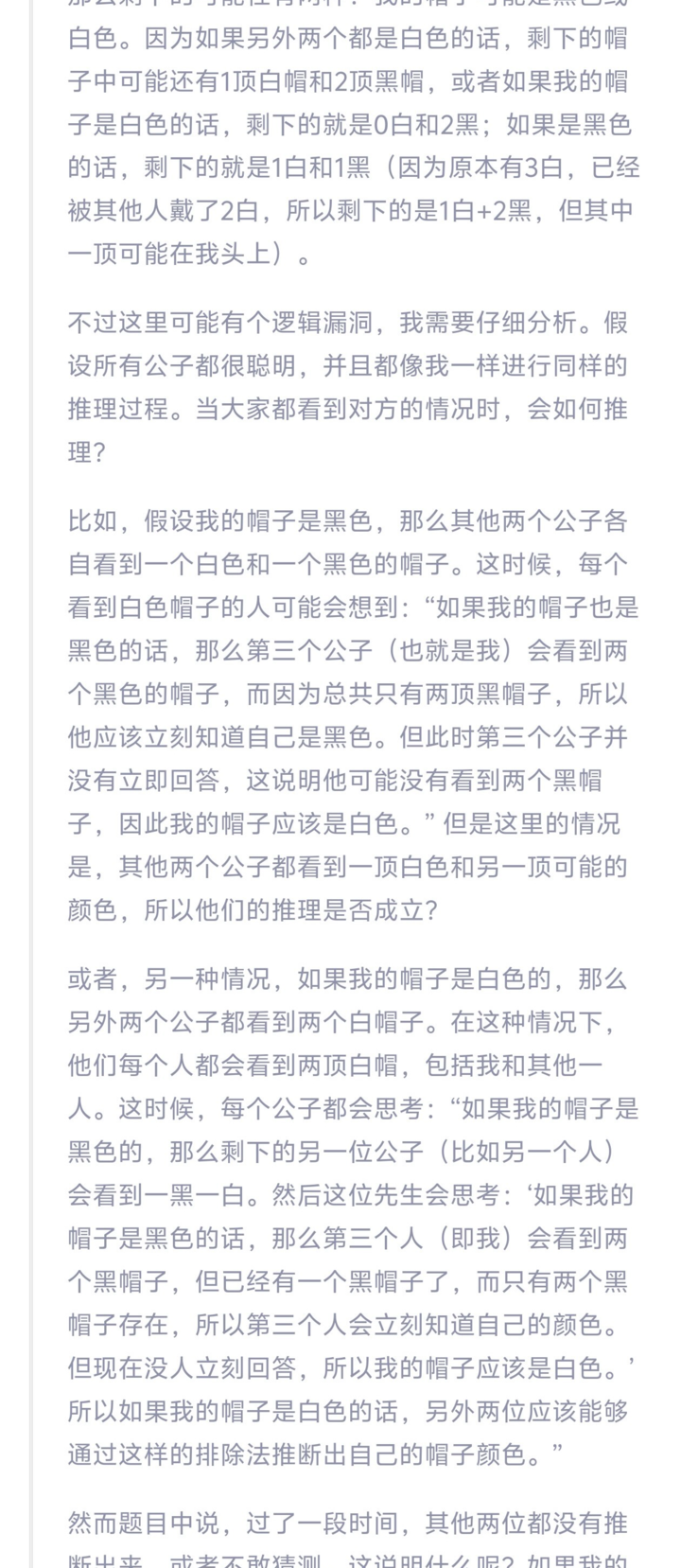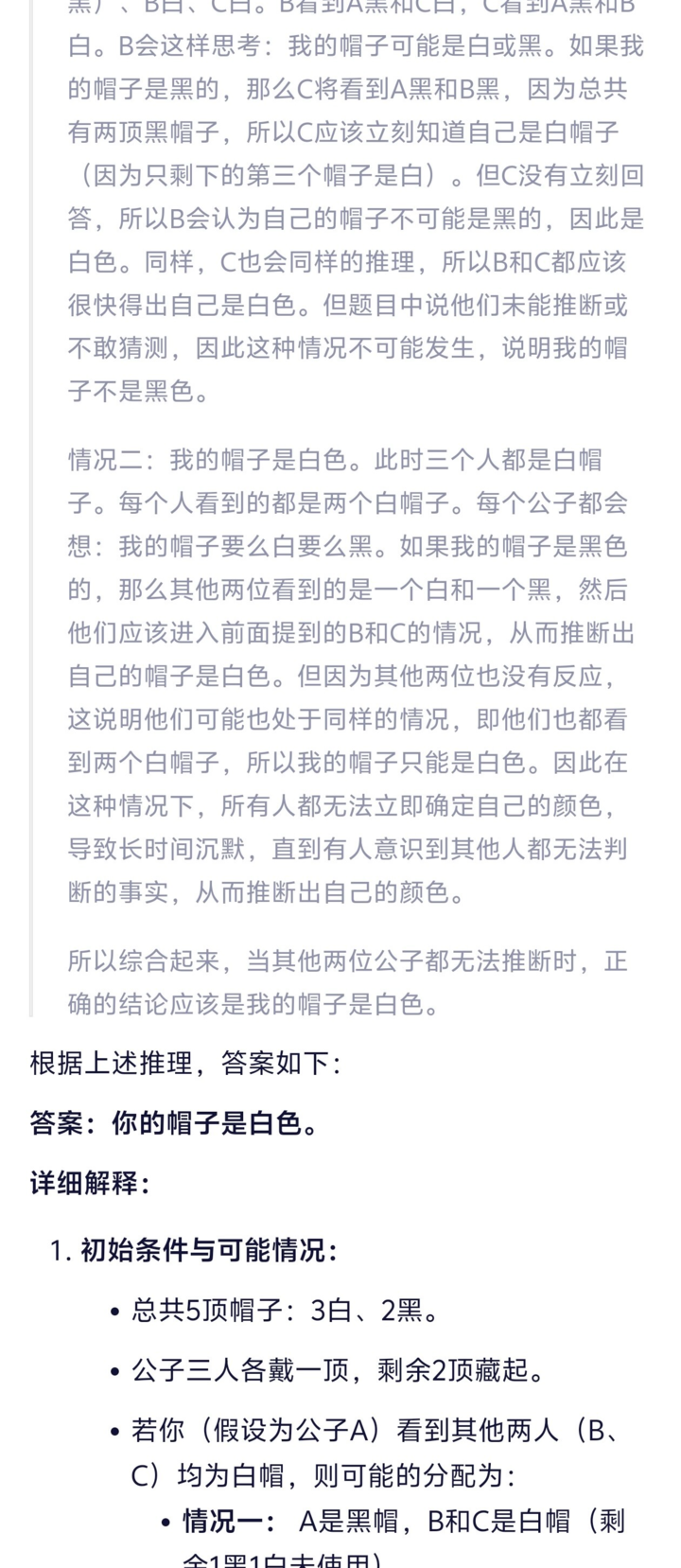 现在你就是其中一个公子,你看到 2 顶白色的帽子在其他公子头上。而过了一些时间,你察觉到其他公子都未能推能或不敢猜测。假设你知道其他公子也是非常聪明的,那么,你的帽子是白色还是黑色?