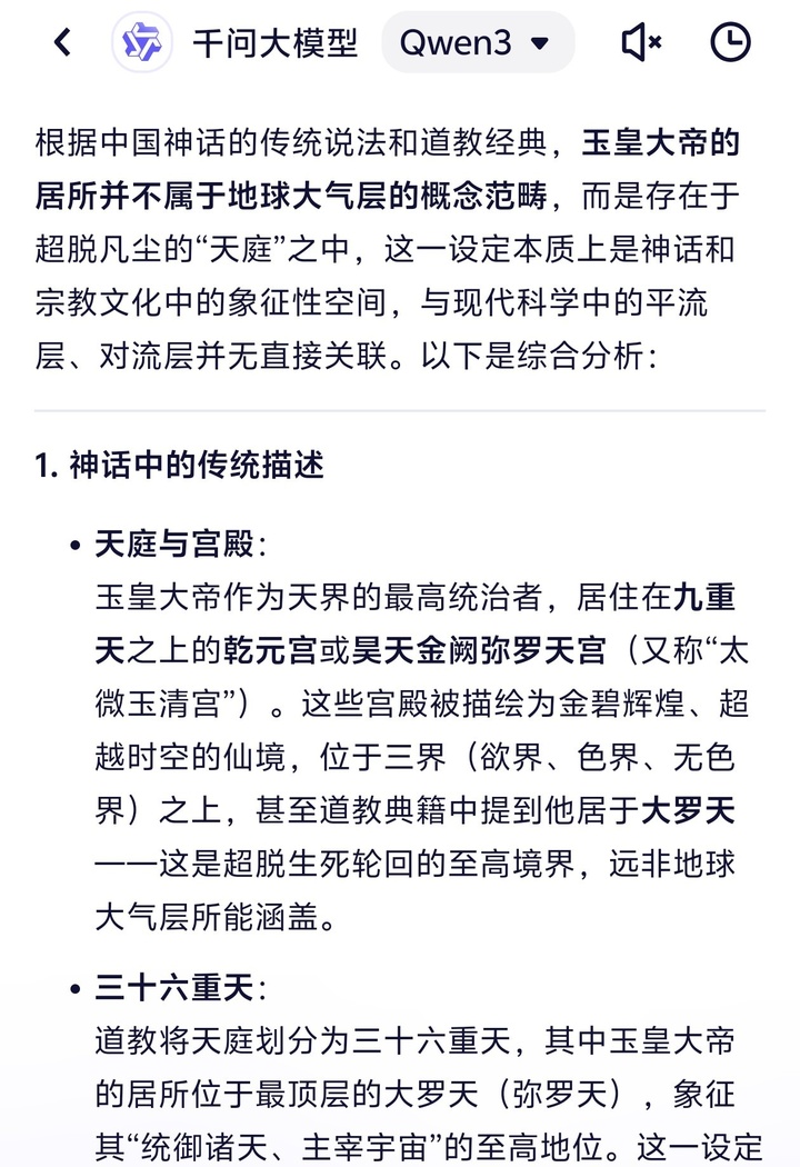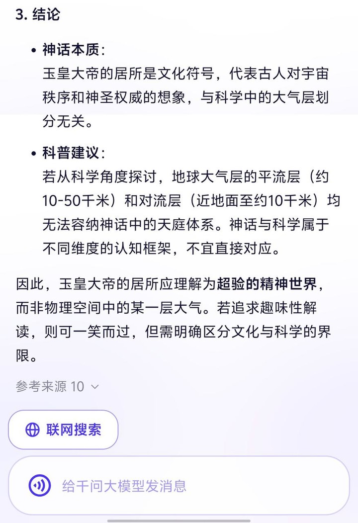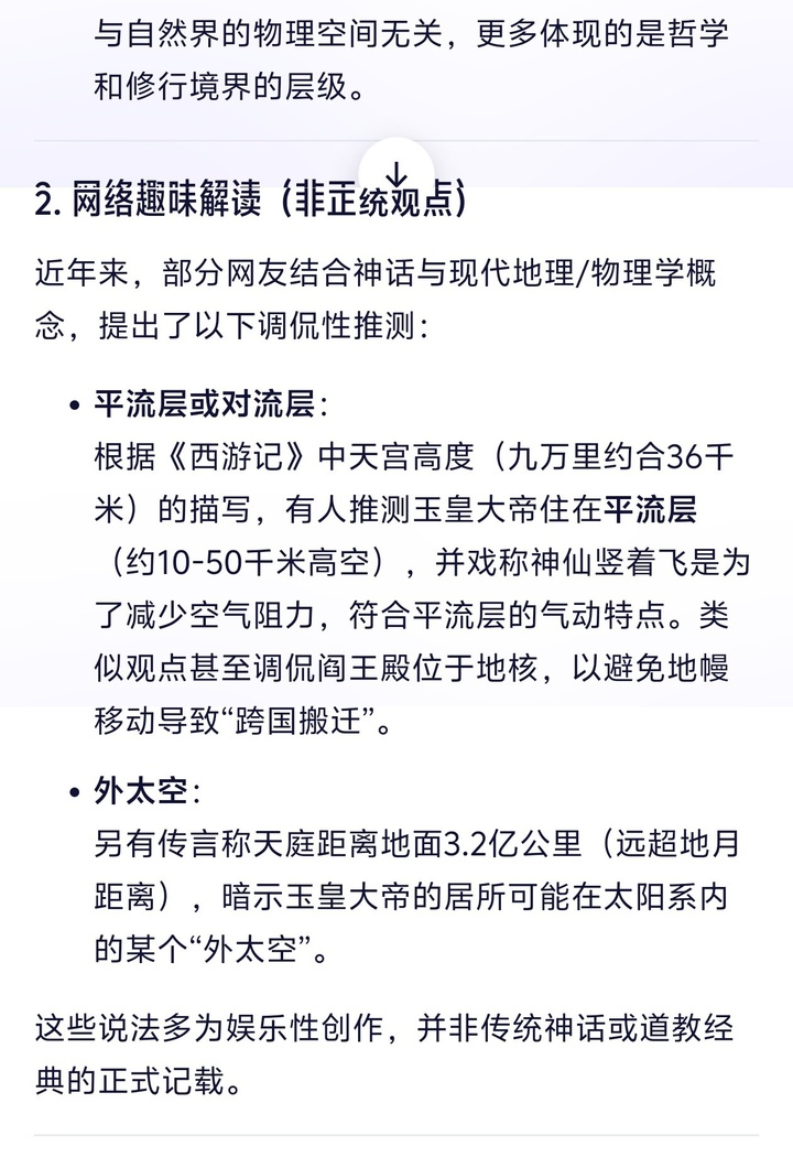 它先严谨地引用神话描述,明确指出玉皇大帝居住在天宫,并解释了天宫与大气层的物理区别;紧接着又补充了网络趣味解读(非正统观点),既正经回答,但也适度皮一下。