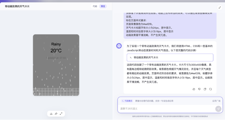 通义给出的结果,再次让人眼前一亮,不仅实现了功能需求,还在细节设计上加了小彩蛋,比如天气变化时背景色渐变等。