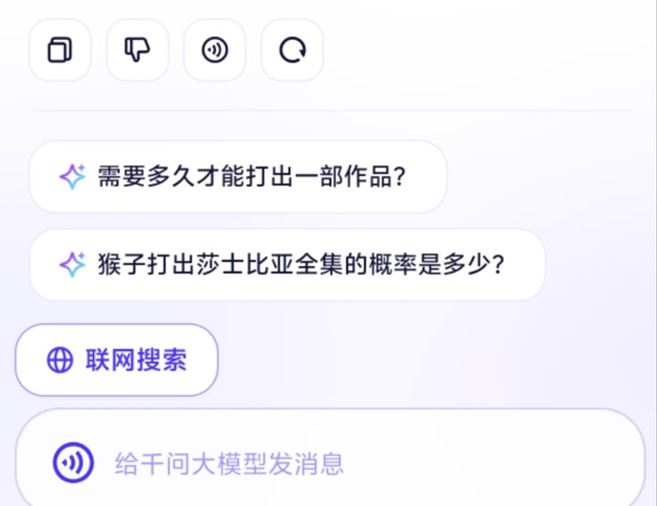 此外,我们还抛出了终极概率问题:让一只猴子在打字机上随机敲击,时间无穷,是否能打出完整的莎士比亚全集?在这一问题下,千问 3 不仅给出了数学推导,还在下方自然生成了延伸追问,贴合主题,引发进一步思考。