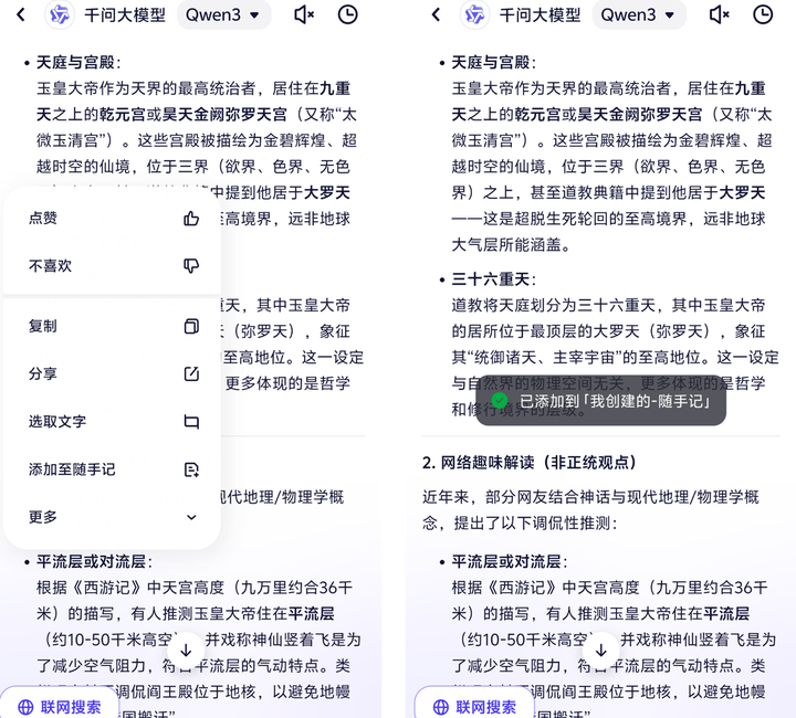 作为一个习惯于收藏优质 AI 回答的用户,我十分喜欢通义 APP 「添加至随手记」的功能,只需长按内容,便可一键收藏,而如果想与好友分享,也可以直接生成跳转链接,轻松传递。
