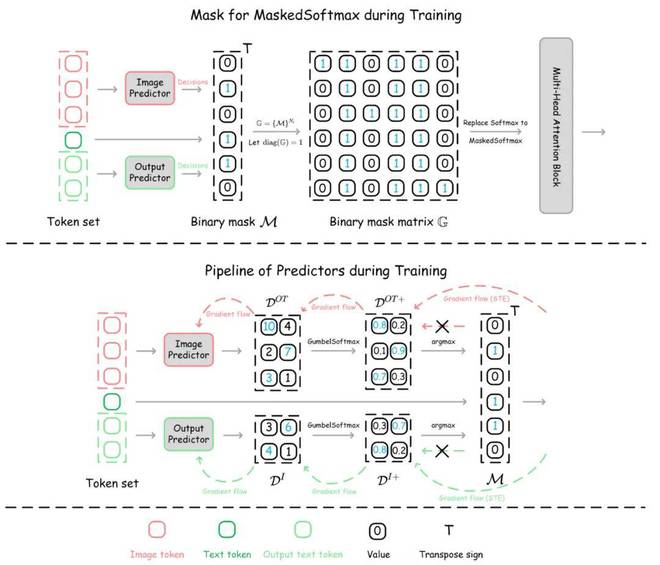Dynamic-LLaVA 是一个需要训练的多模态大模型推理加速框架。我们基于 LLaVA 进行了一个 epoch 的指令微调,以实现对 token 动态选择的稳定性,保证最终的性能。为了保证端到端训练,在训练阶段的稀疏化操作通过 0-1 二值化掩码实现(在推理中的实现是直接从历史 token 序列中丢弃 token)。如图 5 所示,上半部分表示训练中进行 mask 的过程,在得到整个 token 序列的重要性分数后,我们选取前 k 重要的 token 进行保留,相对应的生成掩码向量,其中 0 对应丢弃的冗余 token(不参与注意力过程的计算),1 对应保留的重要 token,进一步基于掩码向量生成注意力过程的掩码矩阵。掩码矩阵用来对多头注意力机制进行掩码操作,以确保丢弃的 token 不参与注意力过程的计算。由于二值化操作会导致不可微问题,所以我们借助了 GumbalSoftmax 和梯度直通估计器(Straight Through Estimator, STE)来保证梯度流的正确传播,以进行端到端的训练,如图 5 下半部分所示。