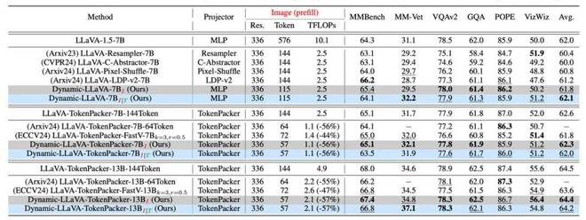 值得一提的是,Dynamic-LLaVA 并没有对 LLaVA-1.5 的视觉 projector 进行修改,就可以实现大幅降低预填充阶段计算复杂度,同时维持模型性能。在表 2 中,和其他针对视觉 projector 做高效设计(以提高推理效率)的 SOTA 方法进行了对比。相较于其他使用了高效的视觉 projector 的方法,Dynamic-LLaVA 使用和 LLaVA-1.5 相同的 MLP 结构作为视觉 projector,实现了更好的性能,同时也大幅降低了预填充阶段的计算复杂度。此外,Dynamic-LLaVA 也可以和其他使用高效视觉 projector 的方法集成。例如,表 2 中 Dynamic-LLaVA 使用 TokenPacker 这一高效视觉 projector 的版本,在原始的 TokenPacker 方法基础上,进一步减少了视觉 token。相较于其他基于 TokenPacker 的推理加速方法,性能损失最少。