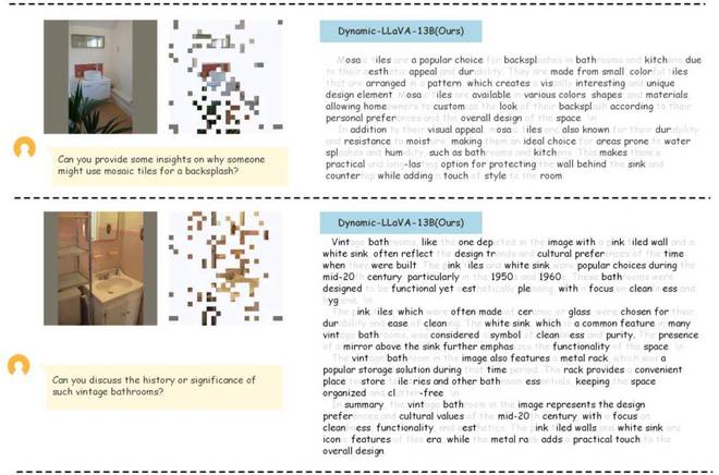 图 6 中展示了 Dynamic-LLaVA-13B 在 LVIS-VQA (single-round) 上的推理结果,以及对视觉和文本 token 的稀疏化情况。可视化结果表明,视觉 token 部分的主要信息得以保留;文本 token 中,一些不影响整体语义理解的连词、介词等被丢弃。这表明 Dynamic-LLaVA 能够实现关键的视觉、语义信息的保留,从而保证了模型整体的性能。