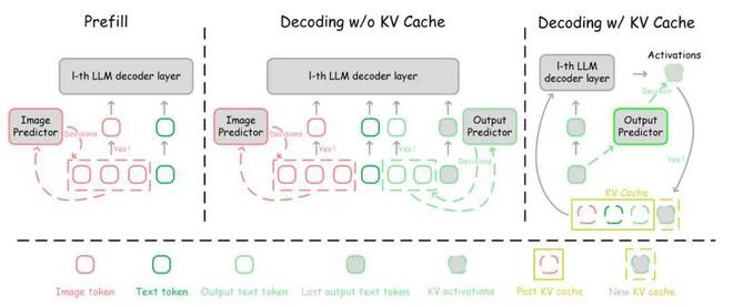 - 最后一个输出的文本 token(即图 2 中间部分的 “Last output text token”),不进行任何处理,完整输入 LLM 的 decoder 层进行计算。这样做的目的是保证模型的输出内容是连贯的,产生新的输出文本 token 时,始终保证自回归运算包含上一个输出文本 token。
