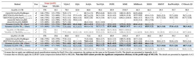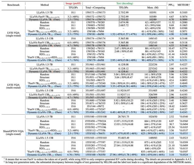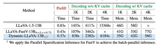 表 4:Dynamic-LLaVA-13B 推理效率实测。其中,2K/4K 表示输出的文本 token 数,所有结果均在一张 A100 (80G) 上测试得出,batch size 固定为 8。“” 表示 GPU 显存耗尽