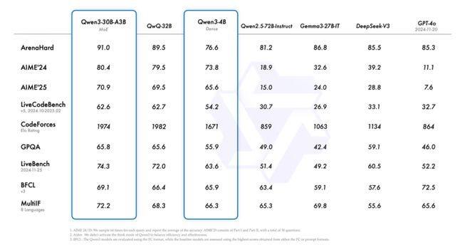 一个亮点是:Qwen3-4B 模型凭借极低的参数量,在一系列基准测试中与 GPT-4o(2024-11-20 版本)打了个有来有回。这体现了阿里在推理效率上的提升并非以牺牲能力为代价。