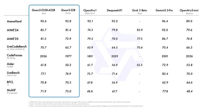 阿里的 Qwen3 迅速引入 MoE 架构和双模式推理设计,将庞大模型在实际使用中的成本大幅降低。凭借 DeepSeek R1 三分之一的参数量,性能全面超越 R1。