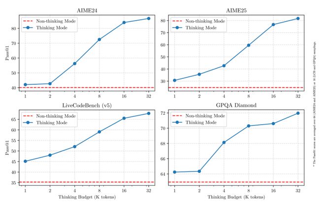 除了基准测试上亮眼的表现外,Qwen3 系列这回的一个主要创新特点是:混合思考模式。这种设计让用户能根据任务难度控制模型的推理量:思考模式下,模型能够逐步推理,适合复杂问题,强调深度思考。无思考模式:模型快速响应,适合简单问题,优先速度。难问题用更多推理,简单问题快速解答。