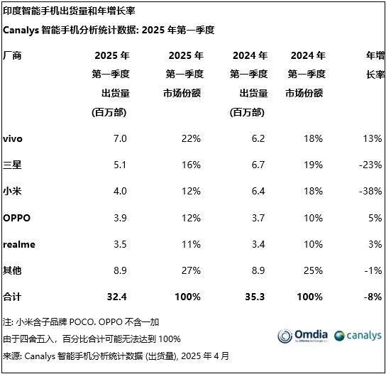 vivo(22%)靠中低端机型(如Y系列)和促销策略在印度市场拿到第一,OPPO(12%)和 realme(11%)分列四、五名。
